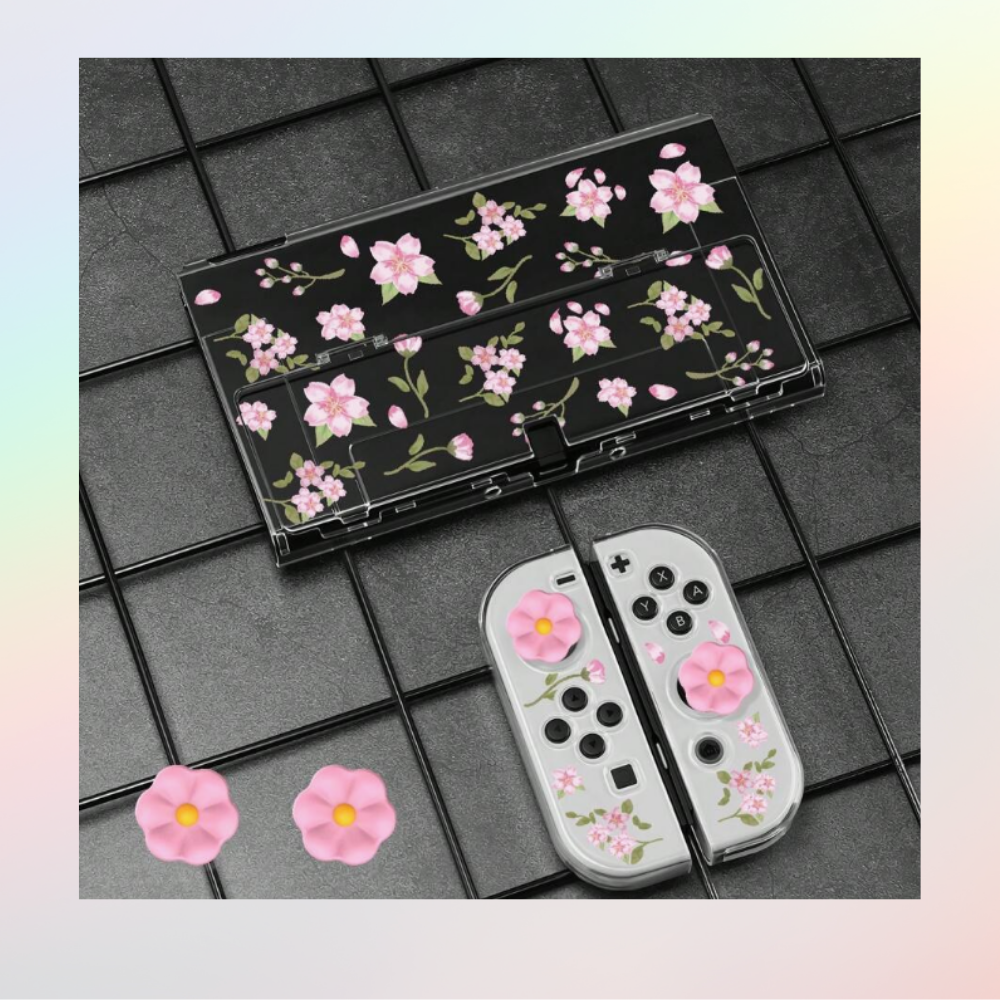 Case protector para Nintendo Switch OLED con diseño floral e incluye grips decorativos y protectores para joysticks.