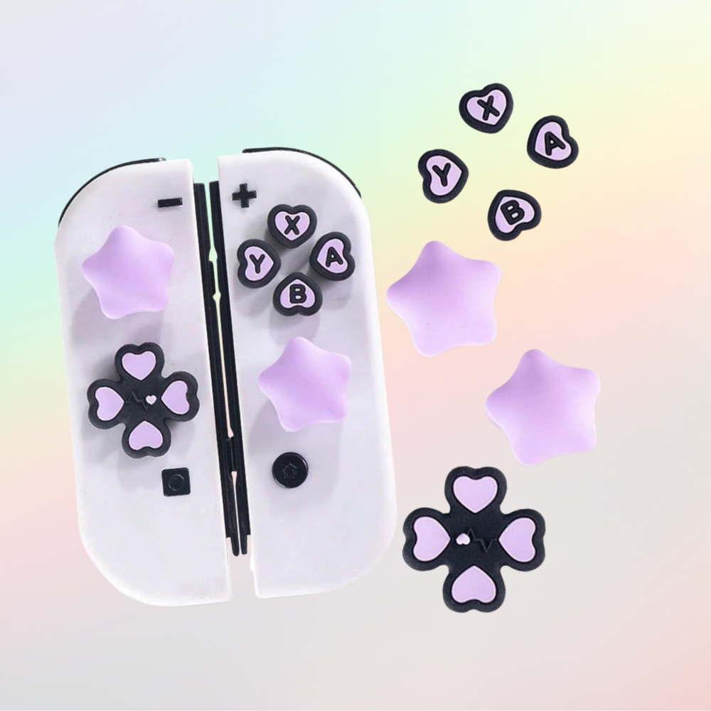 Set de Botones y grips decorativos y protectores para joysticks. Compatibles con Switch Lite, Switch OLED y Switch Standard (B1/B2). Protegen la goma de los joysticks de desgaste y decoran la consola.